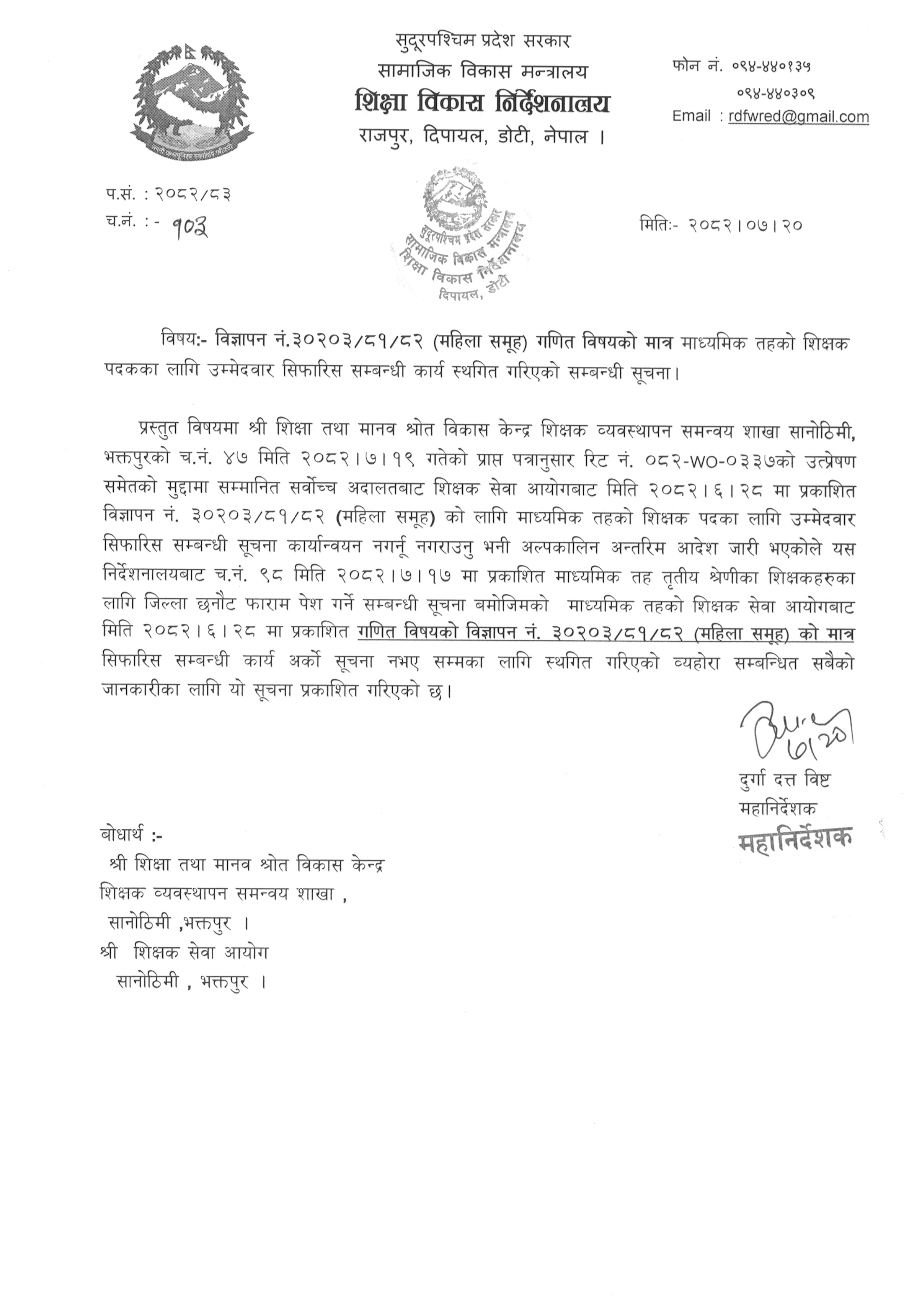विज्ञापन नं. ३०२०३/०८१/०८२ (महिला समूह) गणित विषयको मात्र माध्यमिक तहको शिक्षक पदका लागि उम्मेदवार सिफारिस सम्बन्धी कार्य स्थगित गरिएको सम्बन्धी सूचना ।
